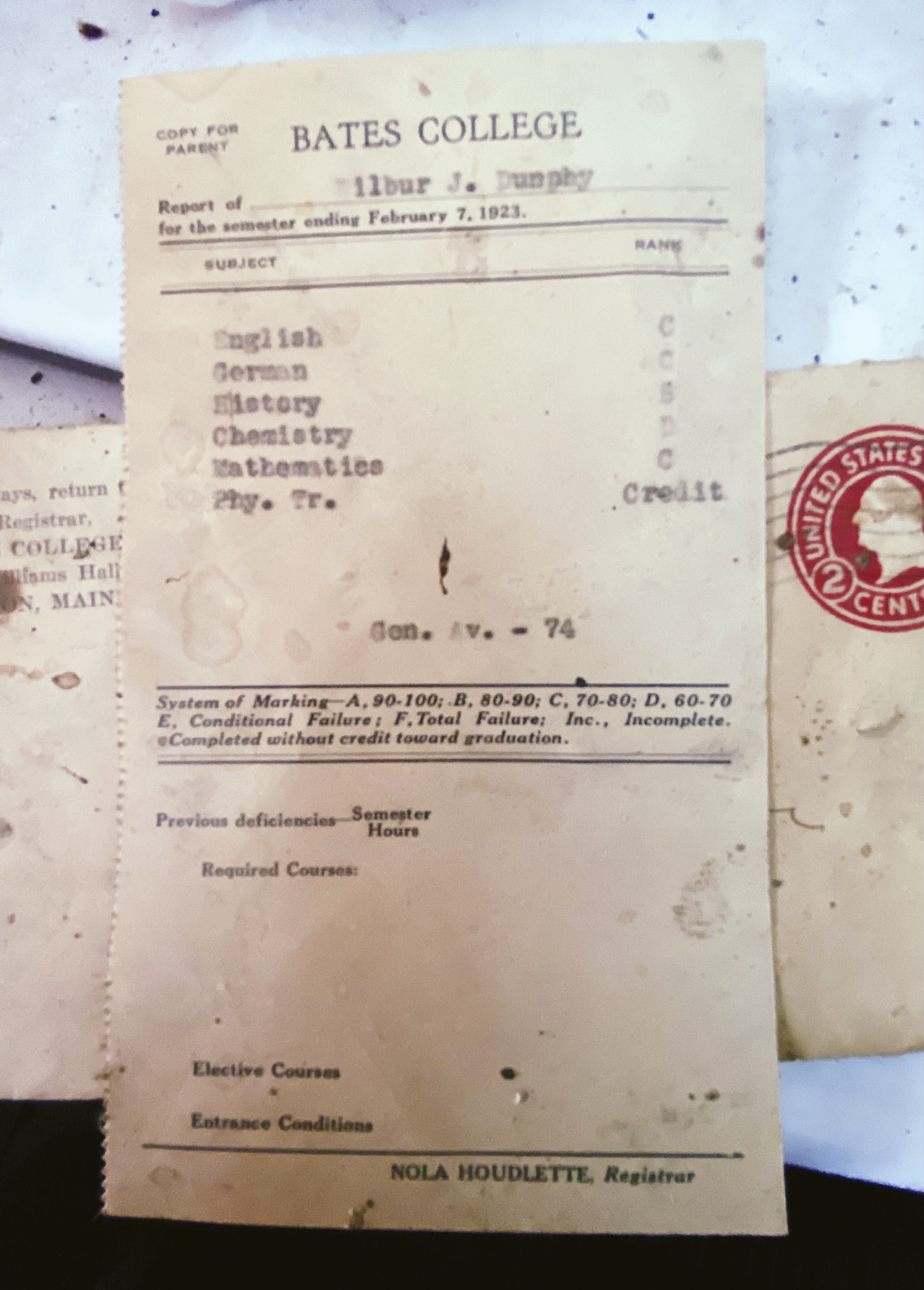 There had been a certain satisfaction to peeking into the walls of the house when they were open. The layers of wallpaper, the framing made with tree trunks, the char from the chimney fires of yesteryear, the knob and tube, the blank spaces where the insulation should have been but wasn’t and the rodents shouldn’t have been but certainly were. The open walls coughed up occasional treasures too: brittle newspapers and magazines, lost toys, and - one of the final ephemera of spring - a smudgy 1923 Bates College report card, sent to Bert J. Dunphy, whose son Wilbur appears to have struggled mightily in Chemistry.